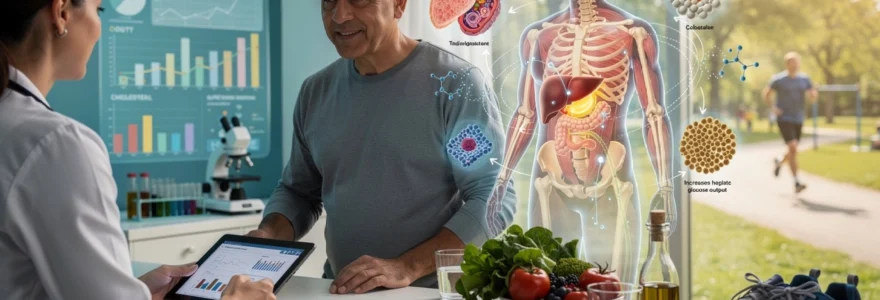 Hepatic steatosis, or fatty liver disease, frequently accompanies insulin resistance and further impairs glucose metabolism. Excess hepatic lipid accumulation interferes with insulin signalling pathways and promotes gluconeogenesis through the